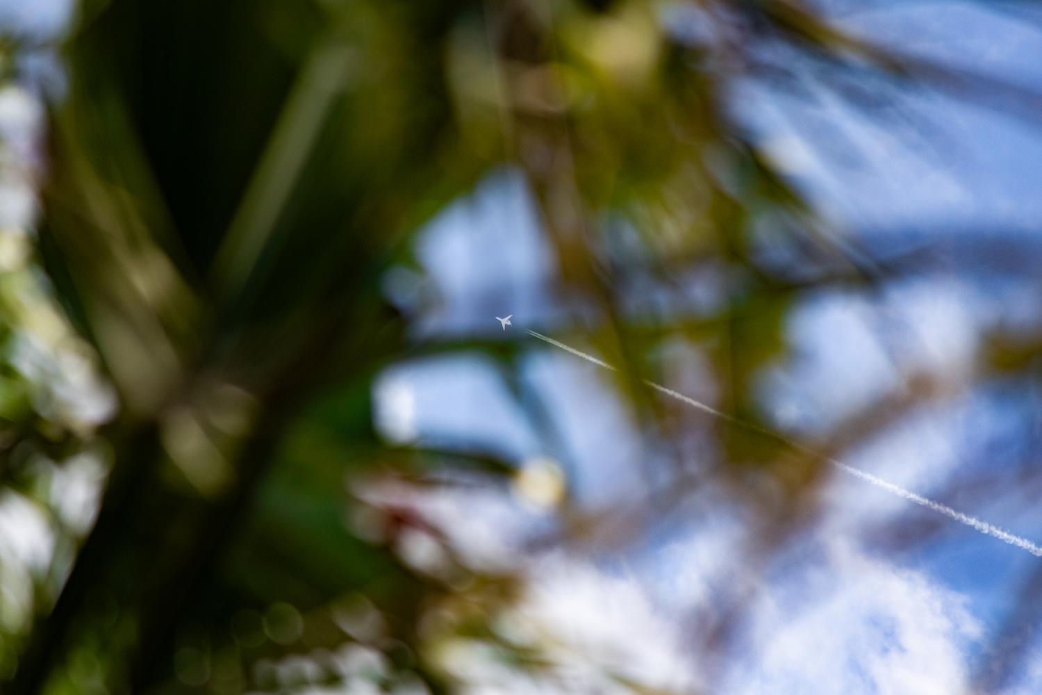 Unknown plane seen cruising high above seen through the palm of a palm tree